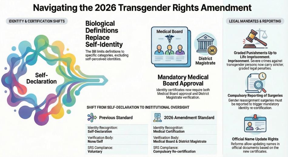 The Transgender Persons (Protection of Rights) Amendment Bill, 2026 was introduced in the Lok Sabha on March 13, 2026, by the Minister of Social Justice and Empowerment. It represents a significant shift in India’s legal approach to gender identity, moving from the 2019 Act’s “self-identification” model back toward a more medicalized and biological framework.