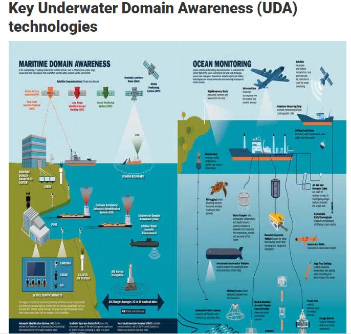 Underwater Domain Awareness (UDA) refers to the ability to monitor, detect, and analyze underwater activities in oceans, coastal waters, and inland waterways. It involves the use of advanced sonar, sensors, autonomous systems, and artificial intelligence to track submarines, underwater drones, mines, and other naval threats.