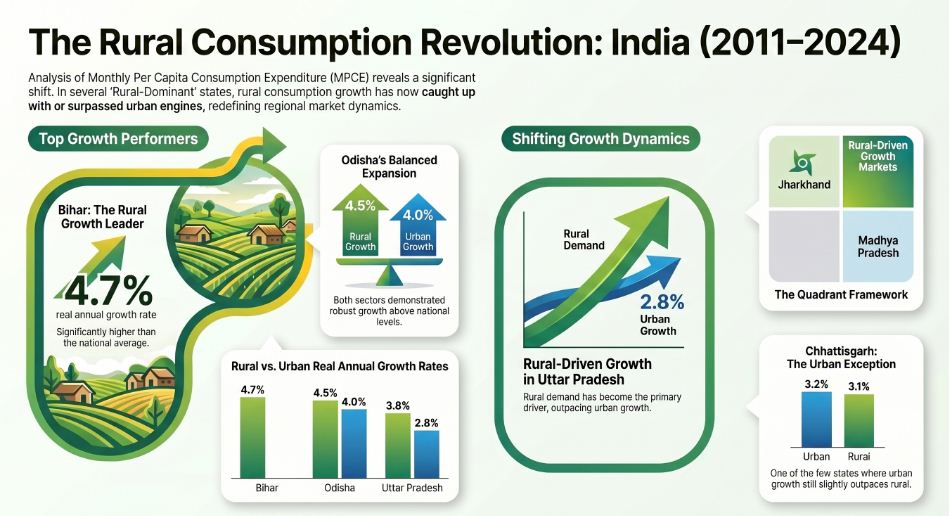 - Bihar (Top Performer): Led in rural consumption. Rural MPCE rose from 1,127 (2011-12) to 3,670 (2023-24), with a real annual growth rate of 7% (significantly higher than the All-India average of 3.4%).