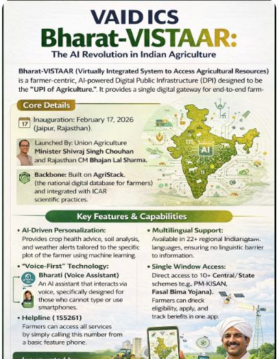 Bharat-VISTAAR (Virtually Integrated System to Access Agricultural Resources) is a farmer-centric, AI-powered Digital Public Infrastructure (DPI) designed to be the “UPI of Agriculture.” It provides a single digital gateway for end-to-end farming support.