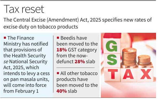 The Finance Ministry also notified that provisions of the Health Security se National Security Act, 2025, which intends to levy a cess on pan masala units, will come into force from February 1.