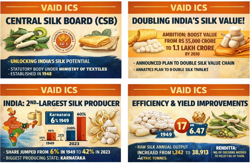 Why in News ? Recently, the Central Silk Board has announced an ambitious plan to double India’s silk value chain, currently valued at Rs 55,000 crore, to 1.1 lakh crore by 2030.