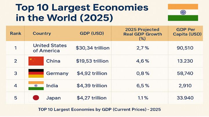 दिसंबर 2025 में जारी आधिकारिक आंकड़ों के अनुसार, भारत ने जापान को पीछे छोड़कर दुनिया की चौथी सबसे बड़ी अर्थव्यवस्था होने का गौरव प्राप्त कर लिया है। भारत की वर्तमान जीडीपी (GDP) $4.18 ट्रिलियन आंकी गई है।