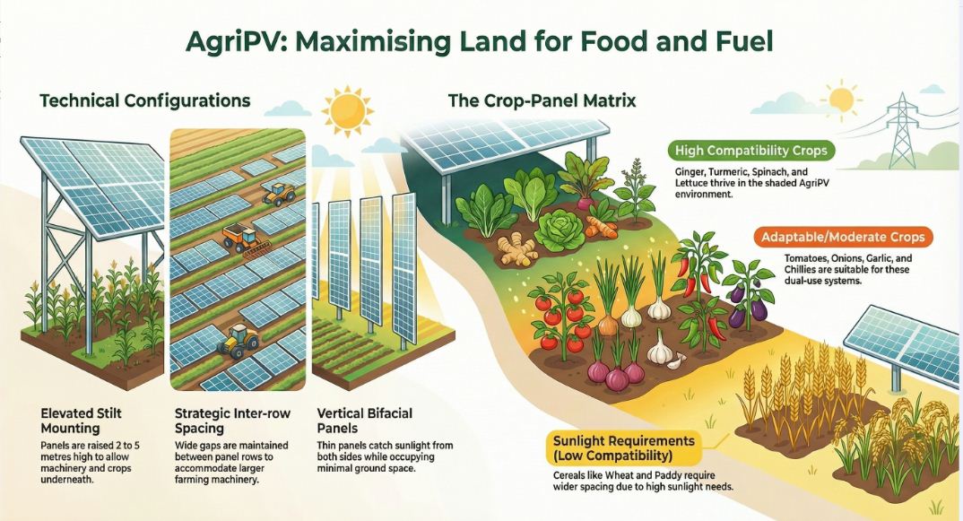 - Solving the Land Conflict: India needs $300\text{ GW}$ of solar by 2030, but land is scarce. AgriPV allows solar expansion without taking land away from food production.