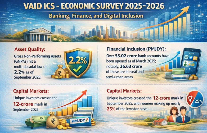 - परिसंपत्ति गुणवत्ता (Asset Quality): बैंकों का सकल गैर-निष्पादित परिसंपत्तियां (GNPA) सितंबर 2025 तक कई दशकों के निचले स्तर 2.2% पर आ गया।