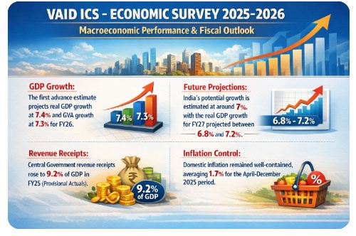 - GDP वृद्धि: वित्त वर्ष 2026 (FY26) के लिए वास्तविक GDP वृद्धि 7.4% और GVA वृद्धि 7.3% रहने का अनुमान है।