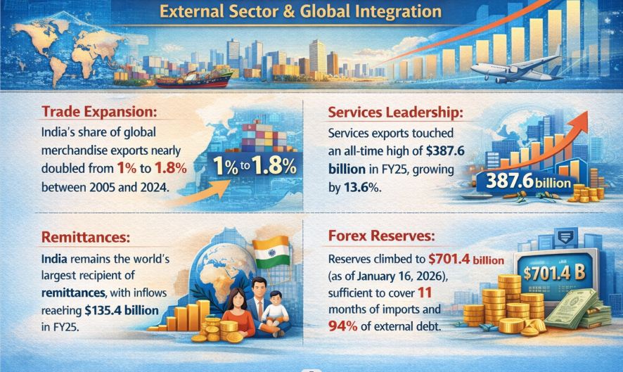 - विदेशी मुद्रा भंडार: 16 जनवरी 2026 तक भंडार $701.4 बिलियन तक पहुंच गया, जो 11 महीने के आयात के लिए पर्याप्त है।