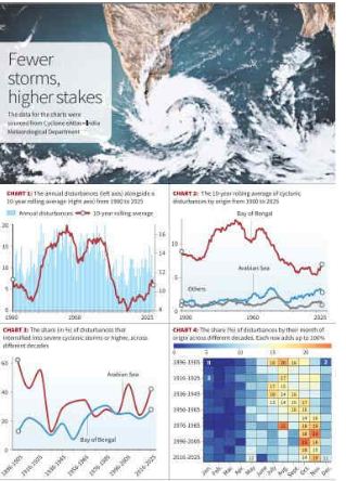- Third, while the number of disturbances has decreased, their severity has intensified. Typically, a disturbance begins as a low-pressure area (winds <31 kmph) and can intensify into a depression (31–49 kmph) or a deep depression (50-61 kmph). Beyond this point, they are classified as cyclonic storms (62-88 kmph) or severe cyclonic storms (89-117 kmph). The most destructive stages follow: very severe (118-166 kmph), extremely severe (167-221 kmph), and super cyclonic storms (≥222 kmph).
