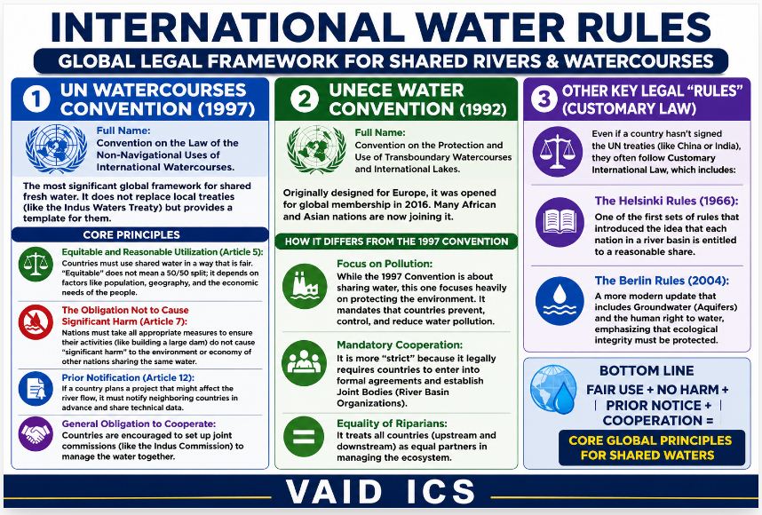This is the most significant global framework for shared fresh water. It does not replace local treaties (like the Indus Waters Treaty) but provides a template for them.