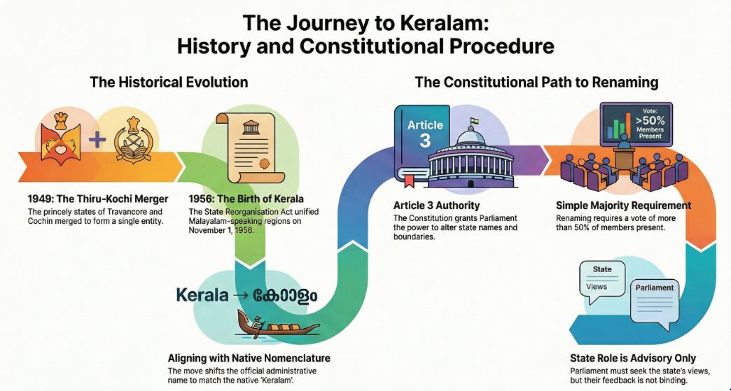 Why in the News? The Union Cabinet, led by the Prime Minister, has officially given its consent to rename the state. This follows two resolutions passed by the Kerala Legislative Assembly (the first in 2023 and again in 2024) urging the Central Government to make this change in the First Schedule of the Constitution.