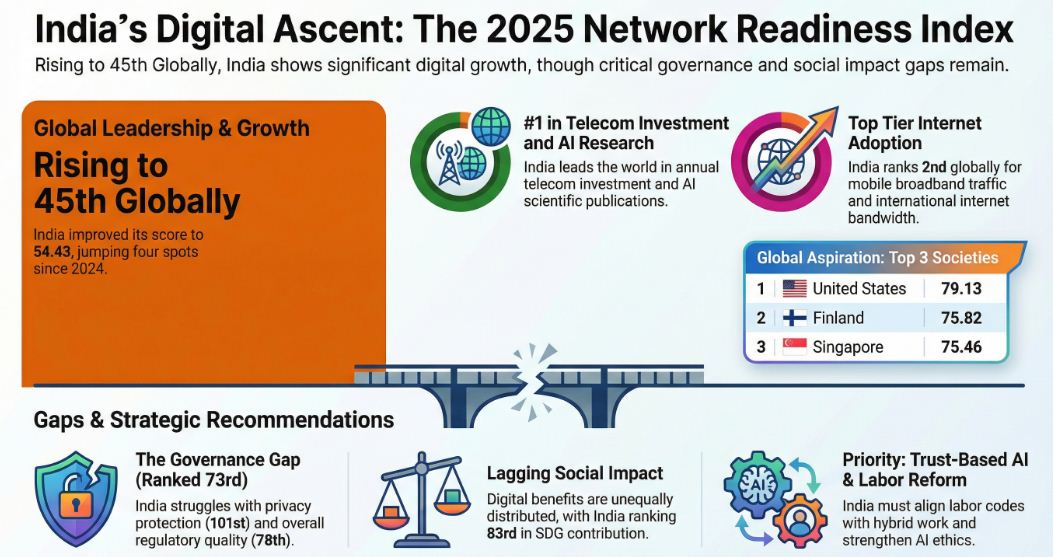 • Governance Gap: India ranks 73rd in the Governance pillar, with specific weaknesses in Privacy Protection by Law (101st) and Regulatory Quality (78th).