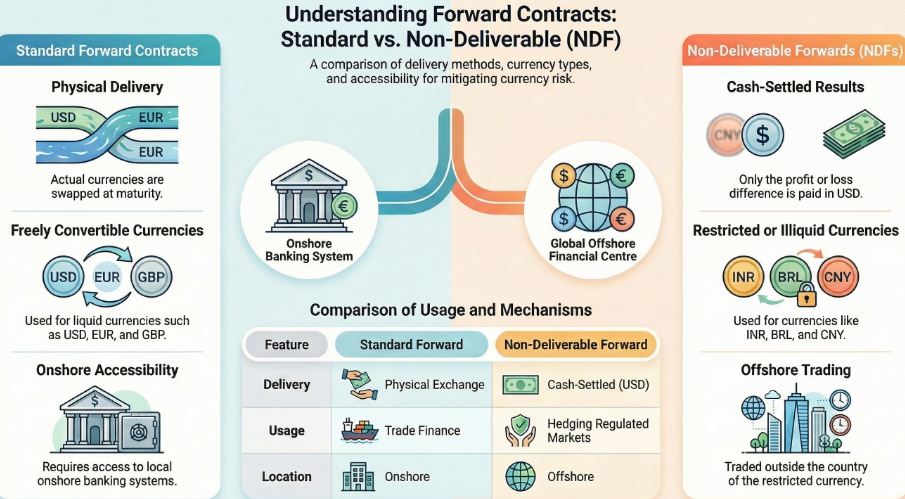 | Feature | Standard Forward Contract | Non-Deliverable Forward (NDF) |