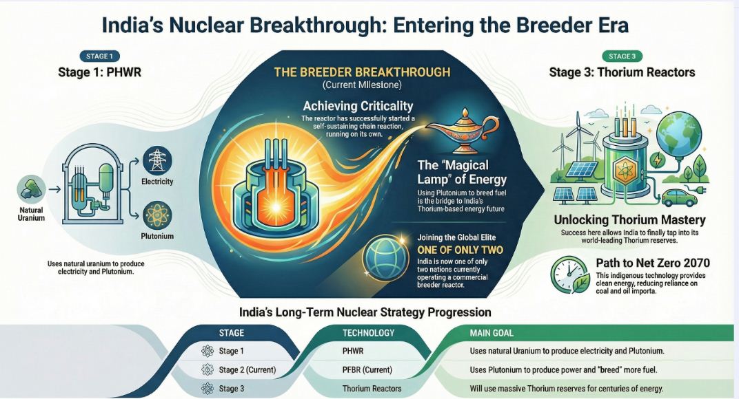 The Prototype Fast Breeder Reactor (PFBR) at Kalpakkam, Tamil Nadu, has achieved “criticality.” * Criticality Simplified: Think of it like successfully starting a car engine for the first time. It means the nuclear reactor has started a self-sustaining chain reaction. It doesn’t need an outside “spark” anymore; it is now running on its own and is ready to eventually produce electricity.