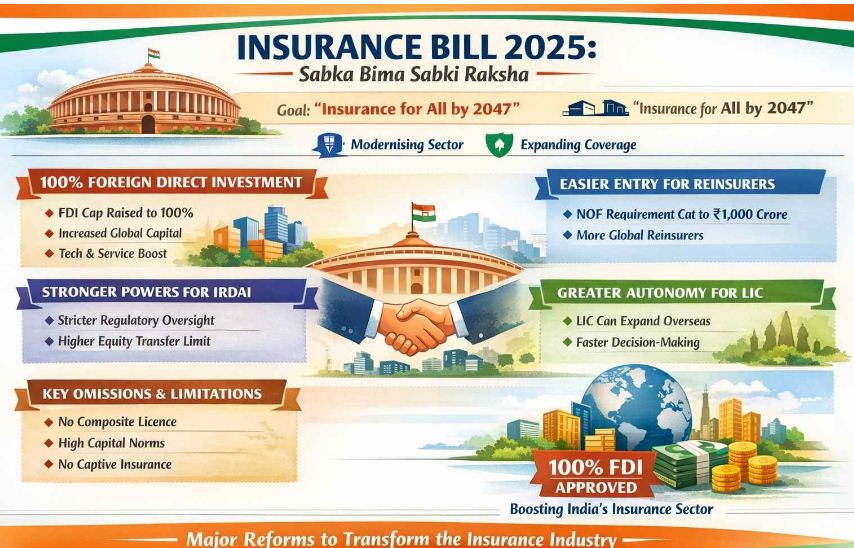 Why in News ? The Rajya Sabha passed the Sabka Bima Sabki Raksha (Amendment of Insurance Laws) Bill, 2025 on Wednesday via a voice vote. This follows the Lok Sabha’s clearance of the bill just a day prior, effectively opening the Indian insurance sector to 100% Foreign Direct Investment (FDI).