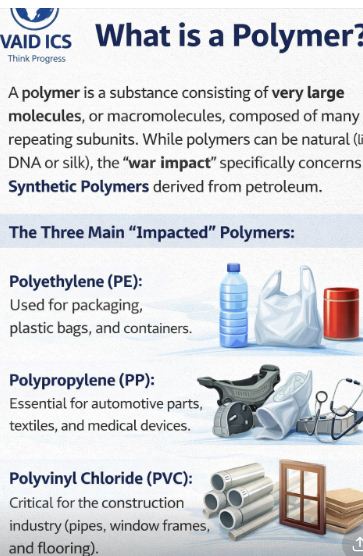 A polymer is a substance consisting of very large molecules, or macromolecules, composed of many repeating subunits. While polymers can be natural (like DNA or Silk), the “war impact” specifically concerns Synthetic Polymers derived from petroleum.