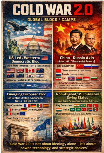 As of early 2026, analysts widely describe the current era as a form of Cold War 2.0, intensified by events like the Russia-Ukraine war, US-China trade/tech decoupling, and China’s growing assertiveness in the Indo-Pacific. It is not identical to the first Cold War—there are no fully sealed ideological blocs, and many countries (including India) hedge and multi-align—but the structural rivalry shapes global affairs.