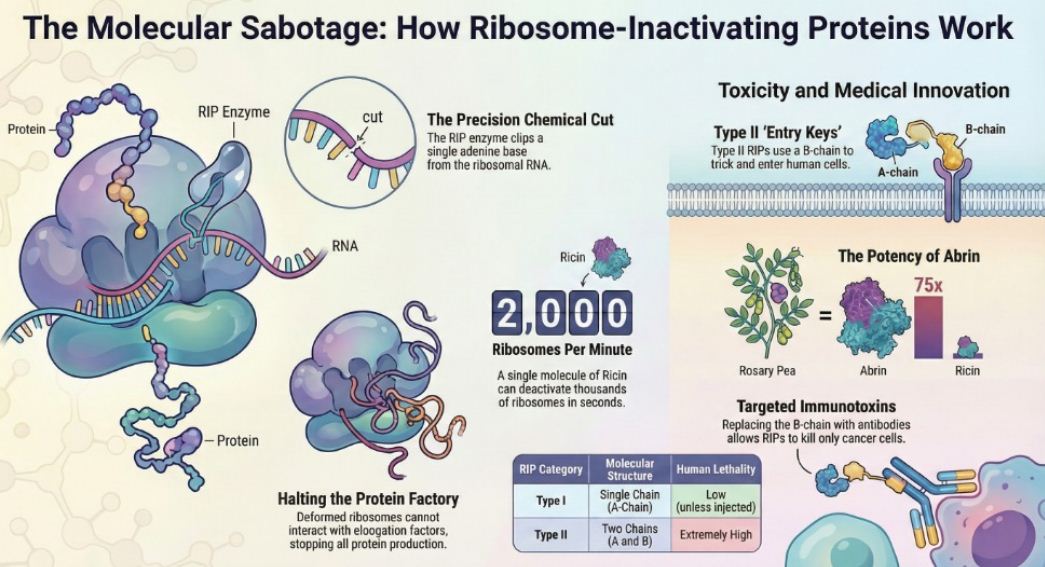 • Mechanism: It is a Ribosome-Inactivating Protein (RIP). It enters cells and physically “breaks” the ribosomes (the cell’s protein factories). Without proteins, the cells die.