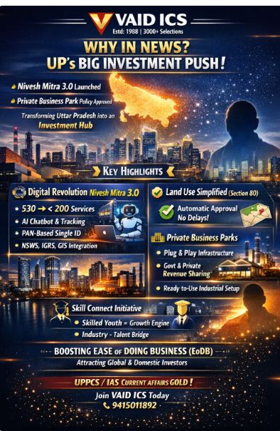 The news highlights the launch of Nivesh Mitra 3.0 and the approval of the Private Business Park Policy. These initiatives are part of the state’s aggressive strategy to enhance “Ease of Doing Business” (EoDB) and attract global and domestic investors by removing bureaucratic hurdles and providing “plug-and-play” infrastructure.