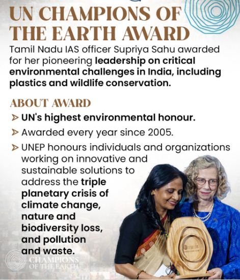 Why in News ?IAS officer Supriya Sahu won “The Champions of the Earth 2025″ award, UN’s highest environmental honour. She has been selected in the “Inspiration and Action” category for her long-standing work on environmental challenges in India and received the award in Nairobi. Sahu currently serves as Additional Chief Secretary in Tamil Nadu government’s Department of Environment, Climate Change, and Forest.